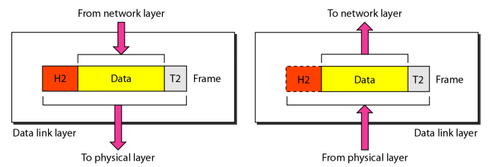 ์ก์ ์ธก์์๋ network layer๋ก ๋ถํฐ ๋ฐ์ดํฐ๋ฅผ ์ ๋ฌ ๋ฐ๊ณ ์ค๋ฅ์ ๋ํด ๊ฒ์ฆํ ์ ์๋ ์ฝ๋๋ฅผ ์ถ๊ฐํ๊ณ ๋ฌผ๋ฆฌ ๊ณ์ธต์ผ๋ก ์ ๋ฌํ๋ค. ์์ ์ธก์์๋ ํ๋ ์์ ํตํด ๋ฐ์ดํฐ์ ๋ํ ์ค๋ฅ ๊ฒ์ฆ ์ฝ๋๊ฐ ์ ํจํ์ง ํ์ธํ๊ณ network layer๋ก ์ ๋ฌํ๋ค.
