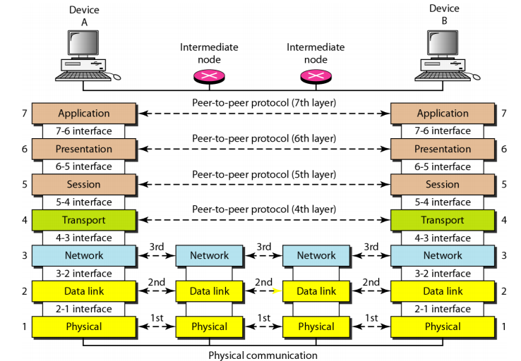 OSI๋ ์์ฉ ํ๋ก๊ทธ๋จ ๊ณ์ธต, ํํ ๊ณ์ธต, ์ธ์ ๊ณ์ธต, ์ ์ก ๊ณ์ธต, ๋คํธ์ํฌ ๊ณ์ธต, ๋ฐ์ดํฐ ๋งํฌ ๊ณ์ธต, ๋ฌผ๋ฆฌ ๊ณ์ธต์ผ๋ก 7๊ฐ์ ๋ ์ด์ด๋ฅผ ๊ฐ์ง๋ค. ํํ, ์๊ฒฉ์ฆ ๊ณต๋ถ์์๋ '๋ฌผ๋ฐ๋ค ์ ์ธํ์'์ผ๋ก ์ธ์ฐ๋ ์ ๋ช ํ ๋ ์์ด๋ค.