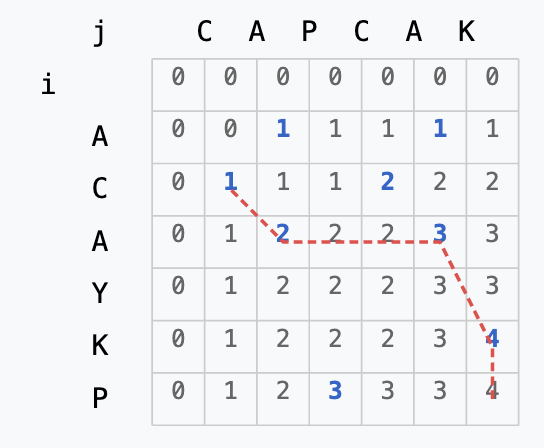 ์๋ฅผ ๋ค์ด, ACAYKP์ CAPCAK์ LCS๋ ACAK๊ฐ ๋๋ค.